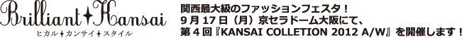 第4回目を迎える『KANSAI COLLETION 2012 A/W』(9月17日開催)では、 これまでのファッションエンターテイメントとして仕掛けていくという打ち出しに加え、 今回は参加者を中心に驚き、感動、発見などの、 女性が持つ感覚的な視野を磨き上げる為のイベント発信を重点とし、 『参加者が携わることによって自分磨きが進化する』を提案してまいります。
