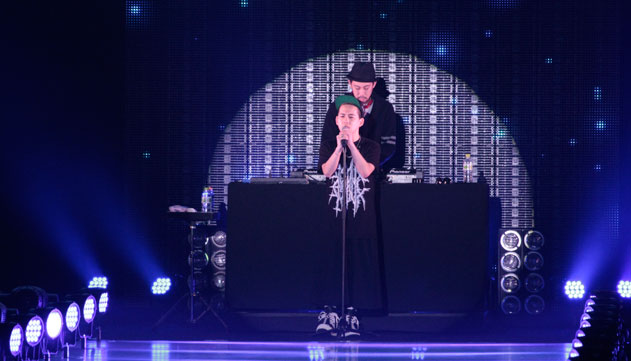 独自のフロウとクリアなマイクパフォーマンスで会場を盛り上げます。